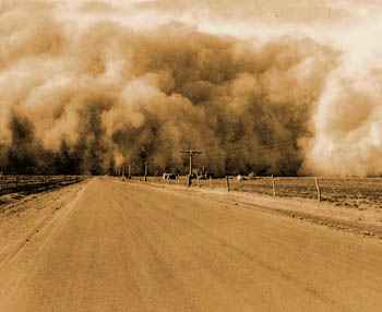 As if there weren’t misery enough, a severe drought over-ran the Great Plains. Giant clouds of dust rose from the dry land, from abused rangeland, and from fields devoured by insects. The soil blew from farms in Texas, Colorado, Oklahoma, Kansas and the Dakotas as far east as Washington, D. C. and into the sea beyond. So was born the infamous Dust Bowl. The land was stripped of productive soil. And men and women were stripped of hope and ambition.