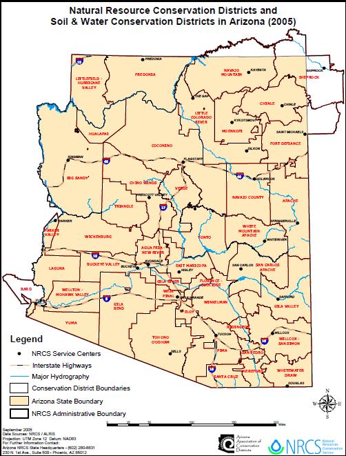Arizona passed its Conservation District Law in 1941. That legislation described its mission as follows: “It is declared the policy of the legislature to provide for the restoration and conservation of lands and soil resources of the state, the preservation of water rights and the control and prevention of soil erosion, and thereby to conserve natural resources, conserve wildlife, protect the tax base, protect public lands and protect and restore this state’s rivers and streams and associated riparian habitats, including fish and wildlife resources that are dependent on those habitats, and in such manner to protect and promote the public health, safety and general welfare of the people”. By 1942, the Secretary of State certified eight Natural Resource Conservation Districts (NRCDs) in Arizona. Now, in 2012 there are 41 districts in Arizona. Of the 41, 9 are Soil and Water Conservation Districts (SWCDs). SWCDs and NRCDs have the same basic objectives except that SWCDs are administered under tribal law. NRCDs are political subdivisions of state government and are administered under state law through the Arizona State Land Department. However, districts operate independently of the State Land Department.